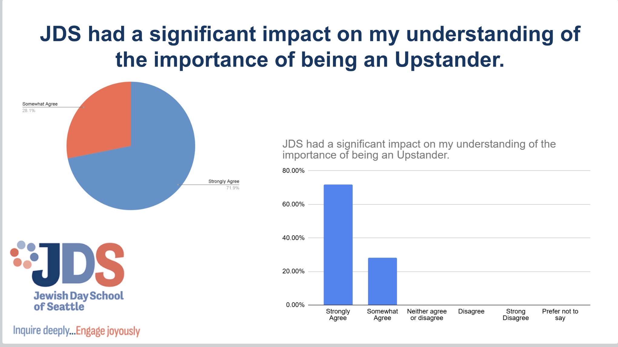 So, what did I learn? I learned that JDS does make Upstanders. All responses to the core prompt “JDS had a significant impact on my understanding of the importance of being an Upstander” were in the positive range, with 71.9% agreeing strongly with this statement. I learned that lessons and activities that allowed students to take a deep dive into the story of one inspiring person had the strongest and most lasting impact on their awareness and confidence in being an Upstander. Respondents reflected about the impact of learning in depth about a Jewish partisan, writing their own historical narrative as a young Jewish person in Germany in the 1930s, learning about morally courageous people, and the Righteous Among the Nations. Connecting in a meaningful way to the stories of inspiring and brave people, who stood up for what was right at risk of their lives, helped my students see the difference one person could make, that even young people can make a difference, and that we never know what we are capable of until we have to.