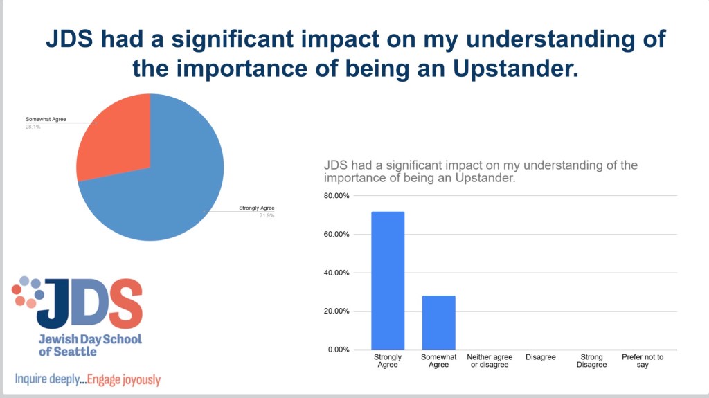 I brought this word back to The Jewish Day School of Seattle (JDS) where I have taught for the past 21 years. At JDS, this word spread from my classroom to the wider community and is now integral to JDS’s Mission, which reads: “JDS empowers children to grow into capable, wise, and compassionate upstanders by integrating an innovative academic program with Jewish education and traditions.”